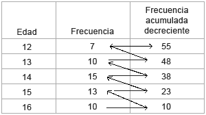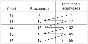 También podemos comprobar que 32 (7 + 10 + 15) personas tienen 14 años o menos. La frecuencia acumulada de la modalidad “14” es 32.