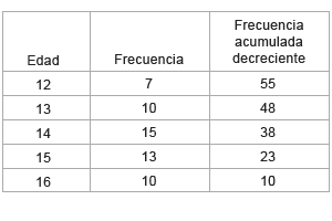 También podemos observar que hay 23 (13 + 10 = 23) personas que tienen 15 años o más. Esto nos permite definir y calcular las frecuencias acumuladas decrecientes mostradas en esta tabla: