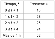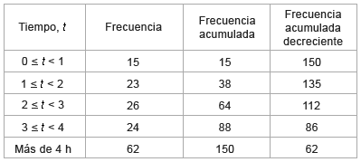 Podemos representar las frecuencias acumuladas o las frecuencias acumuladas decrecientes mediante un diagrama de barras, tal como lo hicimos con los datos discretos. En el diagrama, podríamos llamar a la última clase: 4 ≤ t < 5.