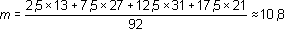 Ahora calculamos la media de estos valores centrales. Como la frecuencia total es 92, (13 + 27 + 31 + 21 = 92), tenemos que: