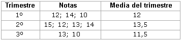 En la segunda columna de la tabla inferior aparecen las notas que un alumno ha obtenido en cada trimestre, y en la tercera columna hemos calculado la media de cada trimestre: