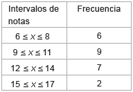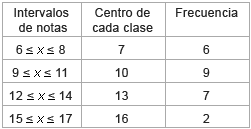 —para calcular la media, hemos de aceptar que cada uno de los 6 alumnos del intervalo 6 ≤ x ≤ 8 obtiene una puntuación de 7. Y tendremos que seguir el mismo criterio para todas las clases. Por lo tanto, la media es igual a:![]()