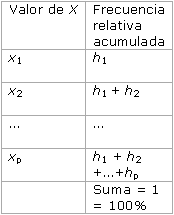 Lo que habitualmente manejamos es la frecuencia relativa acumulada, que para un determinado valor de X se obtiene sumando su frecuencia relativa con las frecuencias relativas de todos los valores anteriores a él. Dicha frecuencia relativa acumulada la expresamos en valor decimal o en tanto por ciento. La frecuencia relativa acumulada del último valor de la serie debe ser igual a 1, que equivale al 100%.