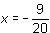 Agrupamos términos semejantes: 20x = 15 – 24, y simplificamos, 20x = – 9.